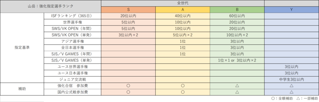 選考条件を満たさない場合でも上位ランク(S・Aランク)の選手は翌年の強化指定から除外されることはありません(ただし、Sランクの選手はAランク、Aランクの選手はBランクへ、1ランク下がる)。ただし、怪我や故障等の特別な理由なくISF/JSA公式戦に不参加の選手(例:ISF/JSA公式戦に不参加で他スポーツに参加している選手)は特例の対象外であり翌年の強化指定選手からは除外されます